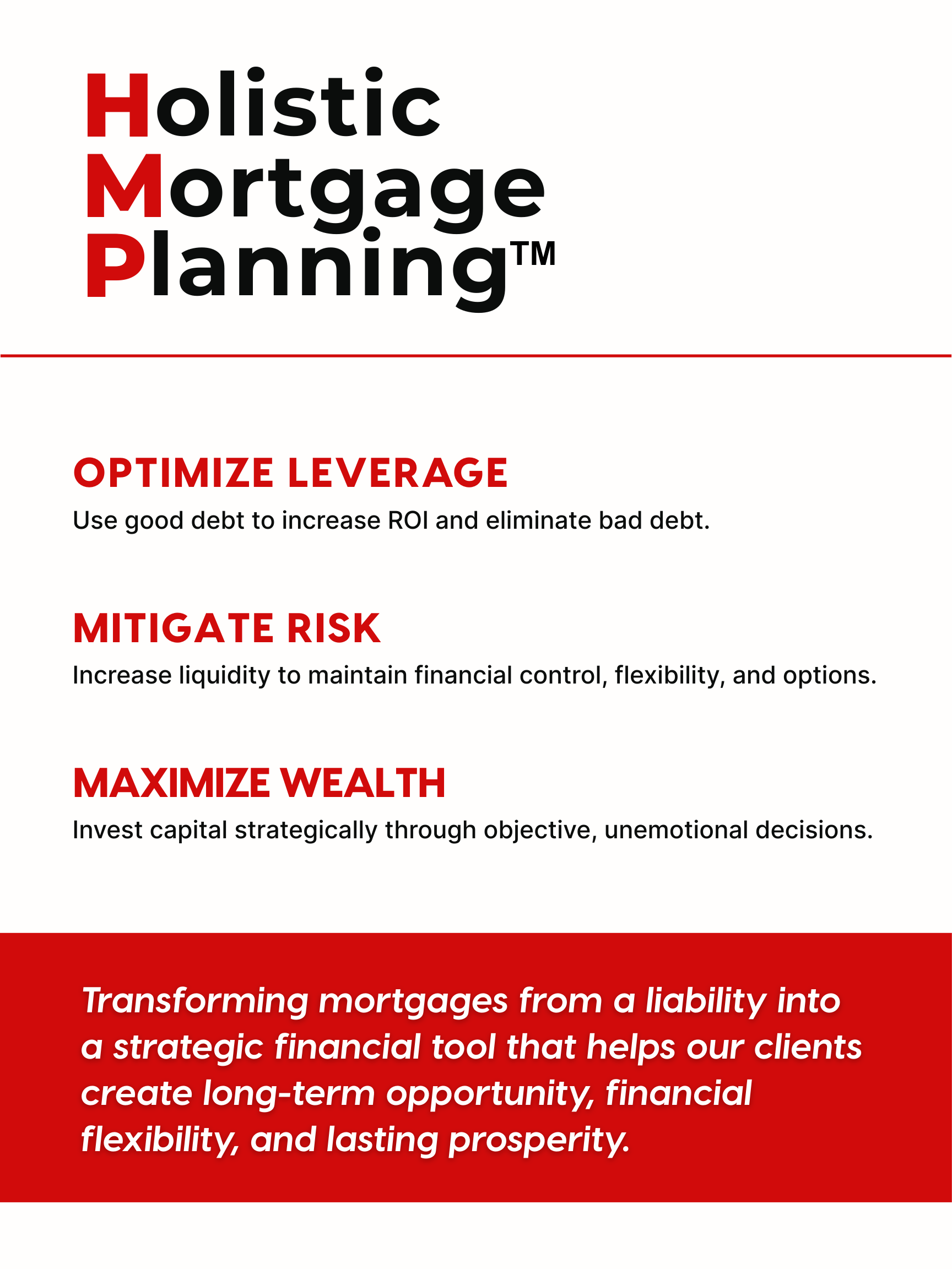 Our approach focuses on structuring mortgage debt strategically through three core principles.